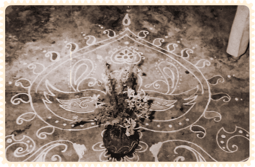 Tiny pieces of clean cloth or white cotton wool is held between the fingers and dipped in the paste and the pattern is drawn freehand.