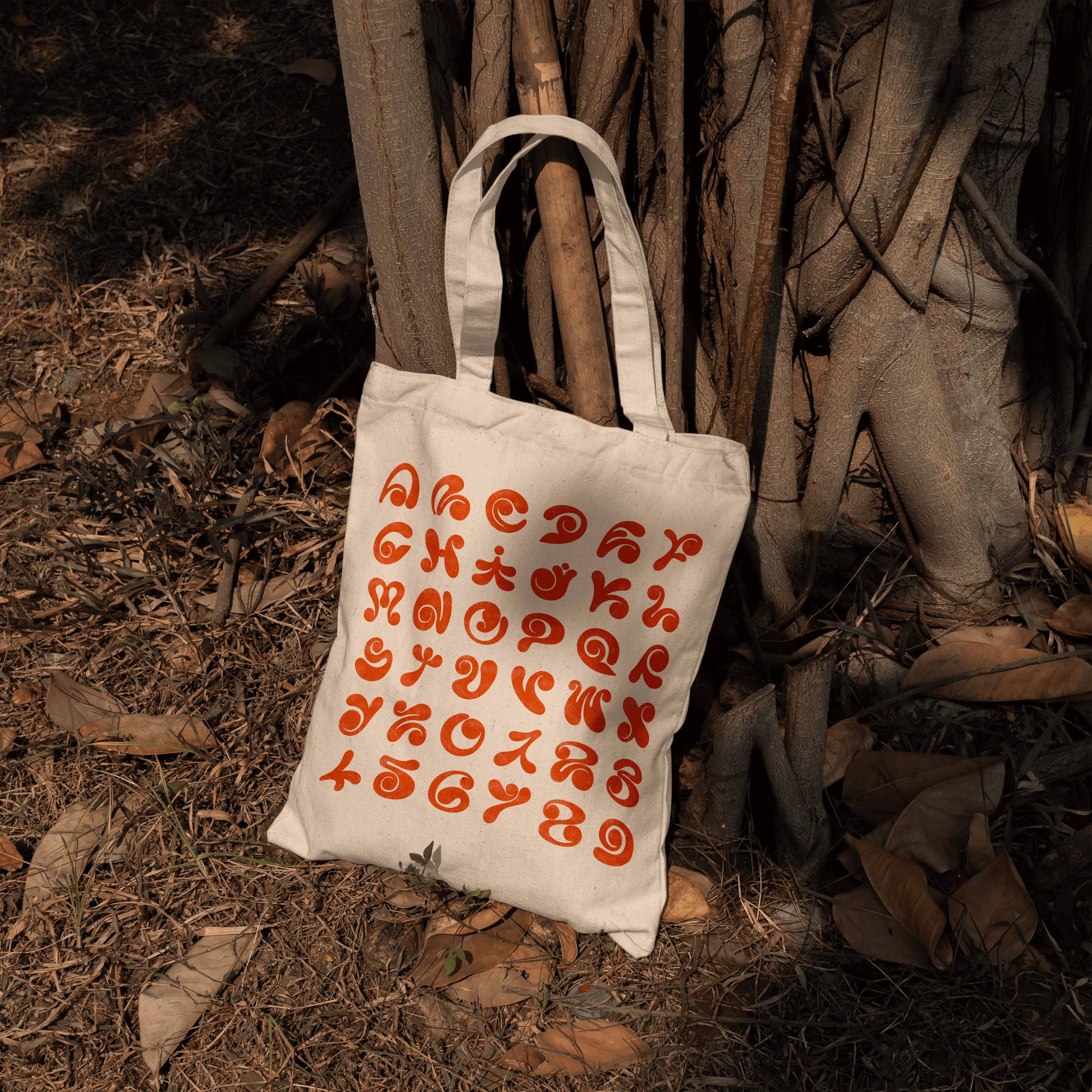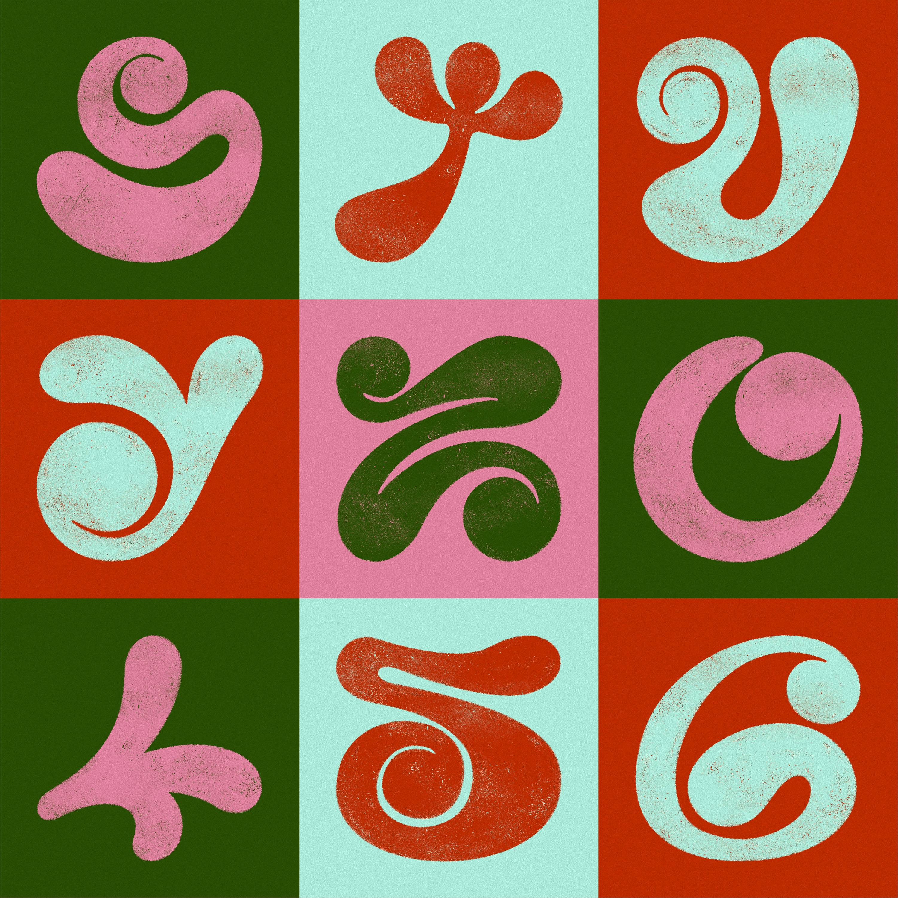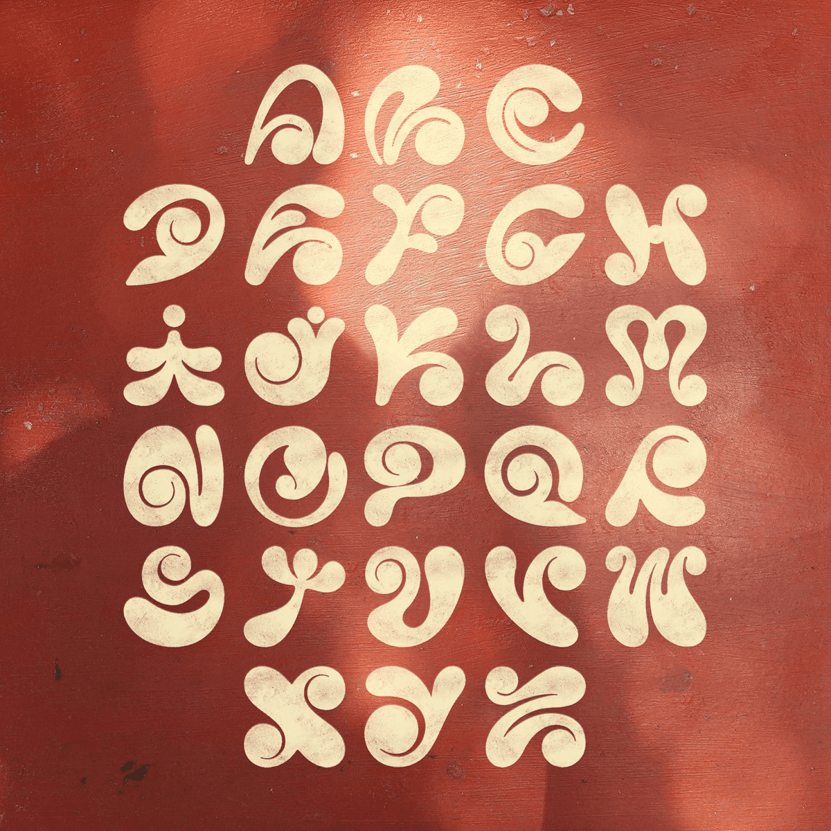Each glyph is constructed using soft, rounded strokes that echo the pressure and movement of fingers gliding across the floor. Hollow and solid forms coexist, referencing the key visual elements of Alpona motifs: paisleys, floral elements, symbolic abstractions, and organic geometry.